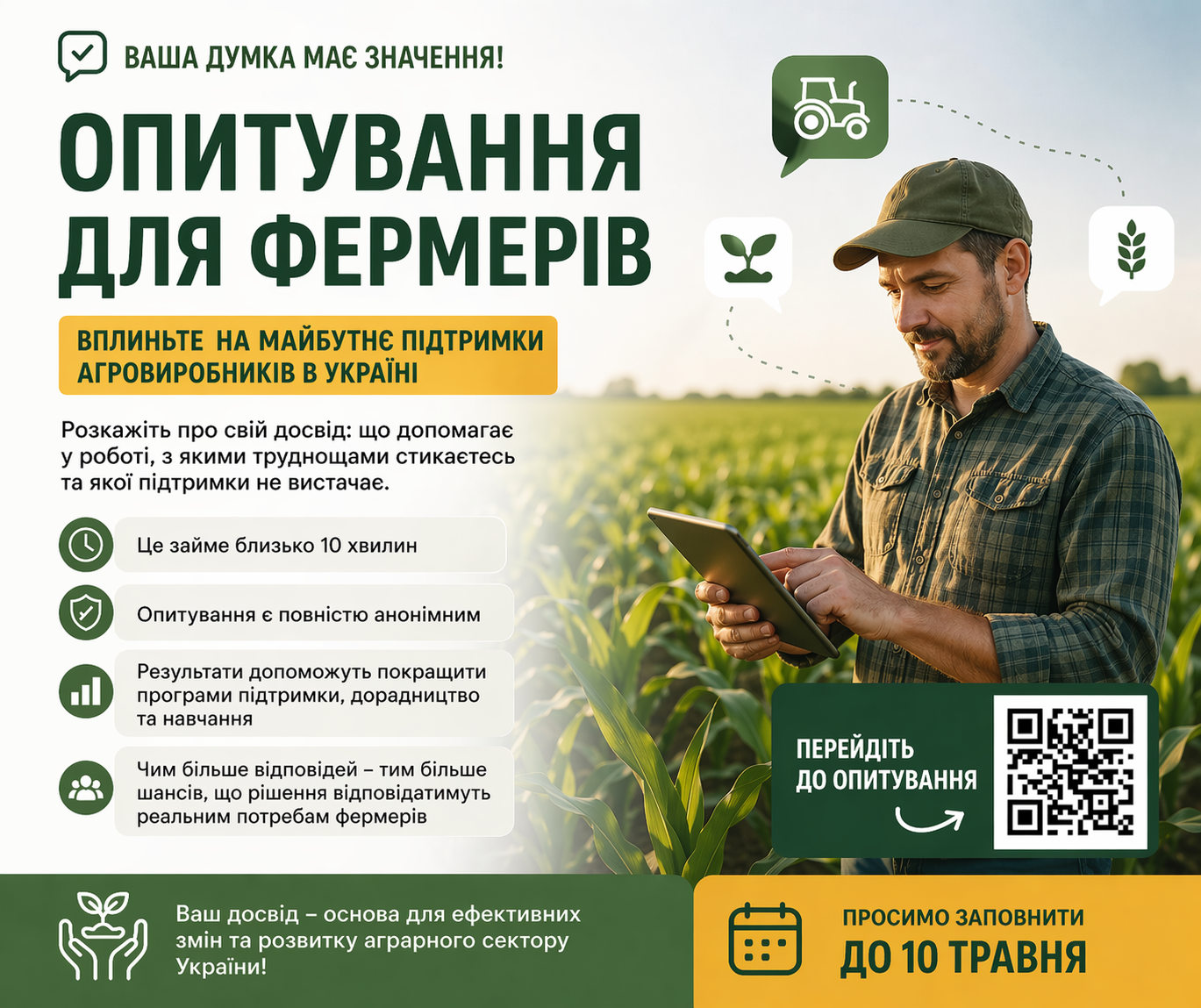 Організатори наголошують, що результати дослідження стануть важливою основою для формування сучасної та ефективної системи дорадництва і розвитку сільськогосподарських знань та інновацій (AKIS) в Україні. Йдеться про створення такої моделі підтримки аграріїв, яка буде не лише формальною, а й реально корисною — зручною у використанні, доступною для різних категорій виробників і орієнтованою на практичні потреби господарств.